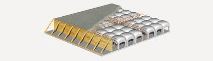 La primera una cubierta a dos aguas, realizada mediante panel sándwich de cubierta de 40mm, con una pendiente mínima de un 7% en sentido longitudinal . Por debajo del panel sándwich se encuentra una cámara de aire de 10cm y dos capas de aislamiento térmico-acústico compuesto por una lana de roca mineral de 40mm/70Kg/m3 y otra de 40mm/40Kg/m3, entre ambas se crea una cámara de aire de 50mm