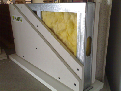 Las divisiones interiores están formadas por un tabique aislado acústicamente mediante lana de roca de 70mm/40Kg/m3 y doble placa de Pladur de 13mm, atornilladas a cada lado de una estructura de 70mm con montantes verticales cada 400mm, dando un ancho total de 12cm.